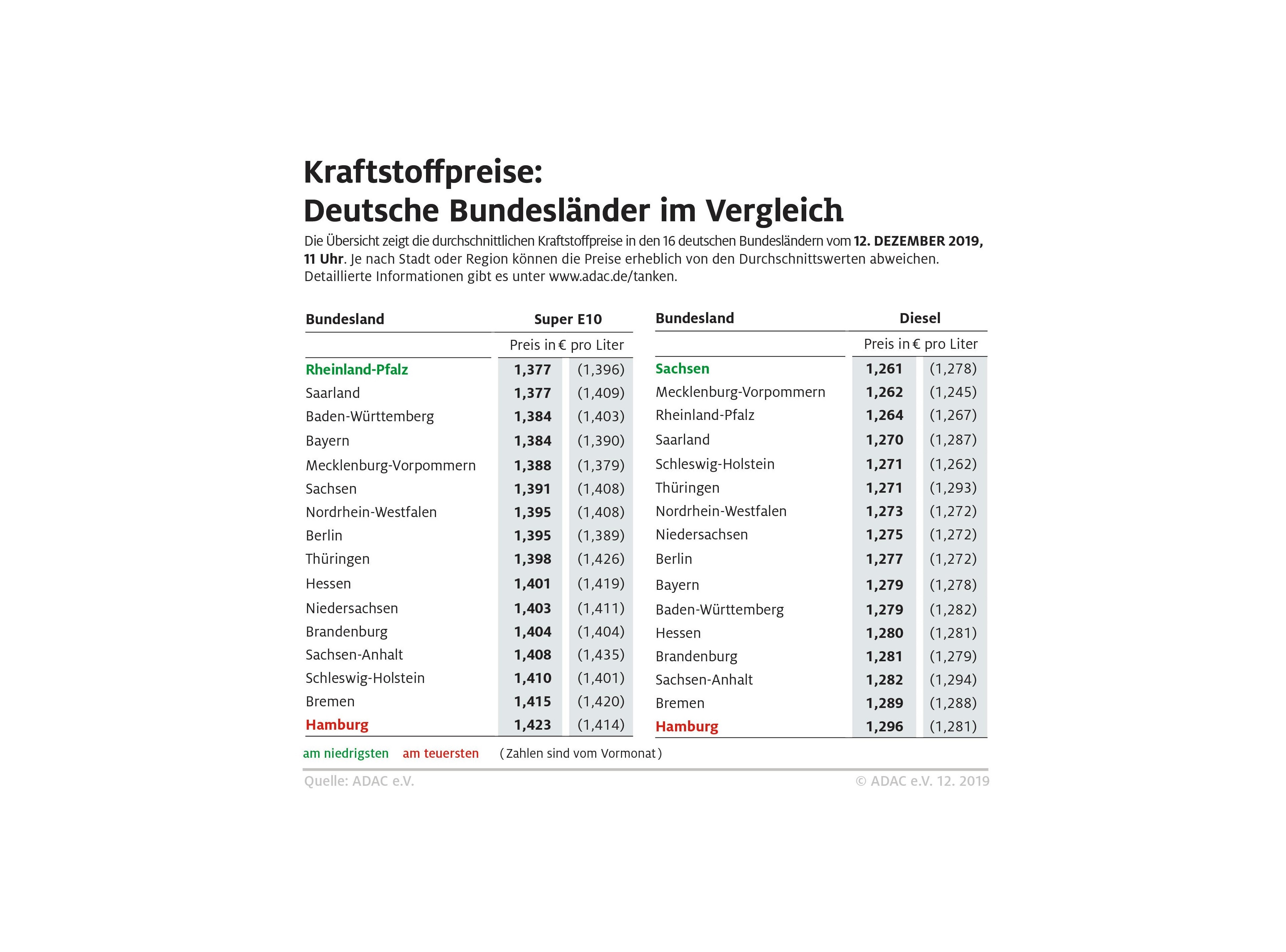 In der aktuellen Untersuchung hat der ADAC am heutigen Dienstag um 11 Uhr die Preisdaten von mehr als 14.000 bei der Markttransparenzstelle erfassten Tankstellen ausgewertet und den Bundesländern zugeordnet. Die ermittelten Preise stellen eine Momentaufnahme dar. Unkomplizierte und schnelle Hilfe für preisbewusste Autofahrer bietet die Smartphone-App „ADAC Spritpreise“. Ausführliche Informationen rund um den Kraftstoffmarkt gibt es zudem unter www.adac.de/tanken.