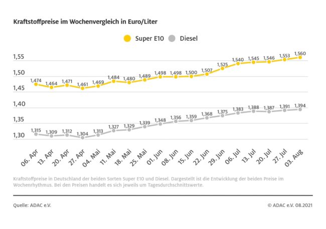 München (ots) – Ungeachtet des leichten Rückgangs der Rohölnotierungen müssen die Autofahrer in Deutschland beim Tanken erneut mehr bezahlen als vor einer Woche. Wie der ADAC meldet, kostet ein Liter Super E10 derzeit im bundesweiten Mittel 1,560 Euro, das sind 0,7 Cent mehr als vor Wochenfrist. Der Preis für Diesel-Kraftstoff stieg um 0,3 Cent auf…
