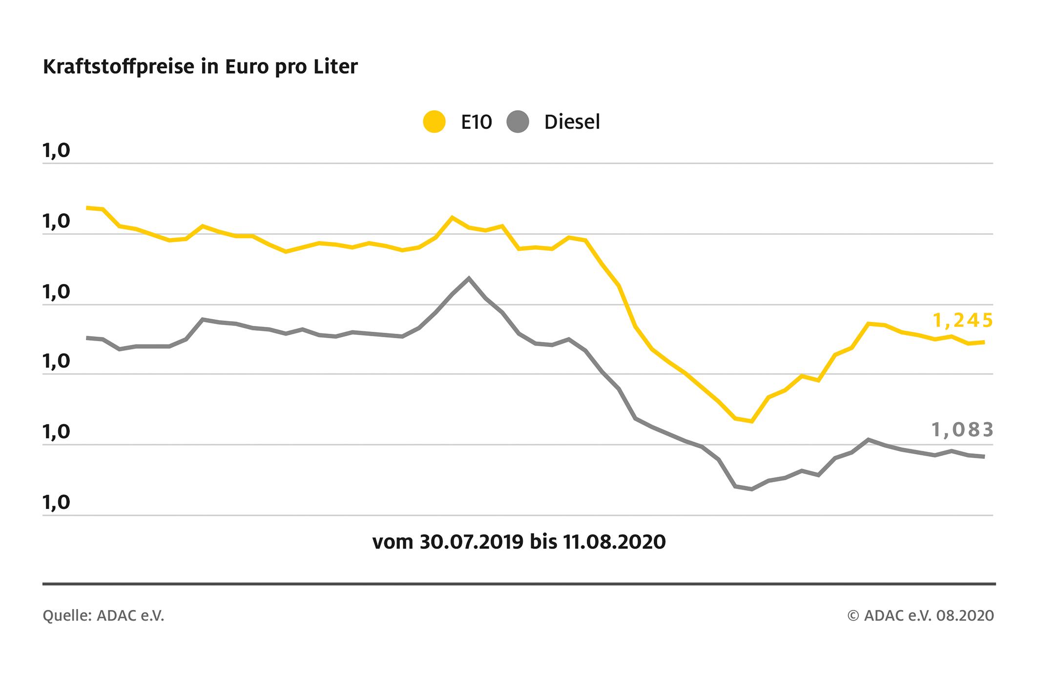 München (ots) – Die Zapfsäulen zeigen diese Woche ein uneinheitliches Bild: Der Preis für einen Liter Super E 10 ist im Vergleich zur Vorwoche um 0,2 Cent gestiegen. Ein Liter Benzin kostet demnach 1,245 Euro, während, nach der Auswertung des ADAC, der Liter Diesel im Bundesdurchschnitt 0,2 Cent weniger und damit nur noch 1,083 Euro kostet.