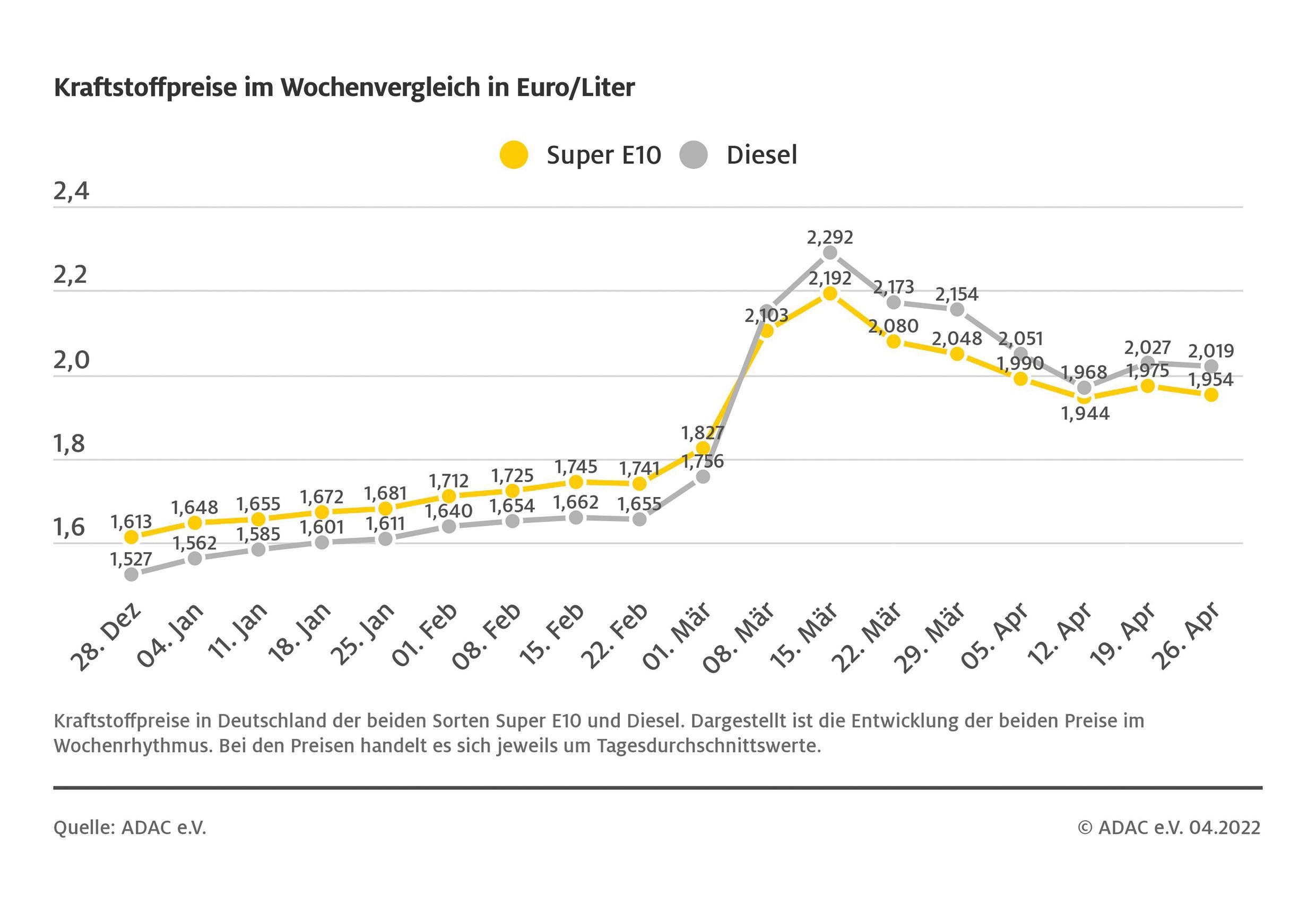 München (ots) – Auch wenn die Kraftstoffpreise in Deutschland im Vergleich zur vergangenen Woche etwas gesunken sind, liegen sie nach wie vor angesichts der Rohölnotierungen auf einem hohen Niveau. Wie die aktuelle ADAC Auswertung zeigt, kostet ein Liter Super E10 im bundesweiten Mittel 1,954 Euro, das sind 2,1 Cent weniger als in der Vorwoche. Diesel ist um 0,8 Cent günstiger und kostet aktuell 2,019 Euro.