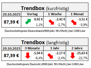 Die genannten Heizölpreise beziehen sich stets auf den deutschlandweiten Durchschnittspreis bei einer Bestellung von 3.000 Liter Heizöl Standard schwefelarm inklusive 19% MwSt. Außerdem fallen durch Transportkosten die Preise regional unterschiedlich aus. Stand der Preise 20.10.2025