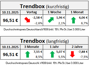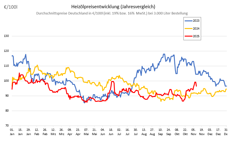 Die langfristigen Preisentwicklungen zeigen weiterhin anhaltende Anstiege im Heizölpreis. Verglichen mit vor 3 Monaten ist Heizöl im Bundesgebiet derzeit +7,55 Euro teurer, aber auch mit Blick auf den frühen November im vergangenen Jahr zahlen Abnehmer zurzeit etwa +5,07 Euro mehr als noch 2024. Blickt man zurück auf den November 2023, sind die aktuellen Heizölpreise im Bundesgebiet dennoch -7,88 Euro günstiger. Das verdeutlicht die untenstehende Grafik nochmal, die klar zeigt, dass die Preise aktuell zwar kurzfristig und im Vergleich zum Vorjahr deutlich angestiegen sind, aber sich sonst noch immer im Rahmen des aktuellen Jahresverlaufs halten.