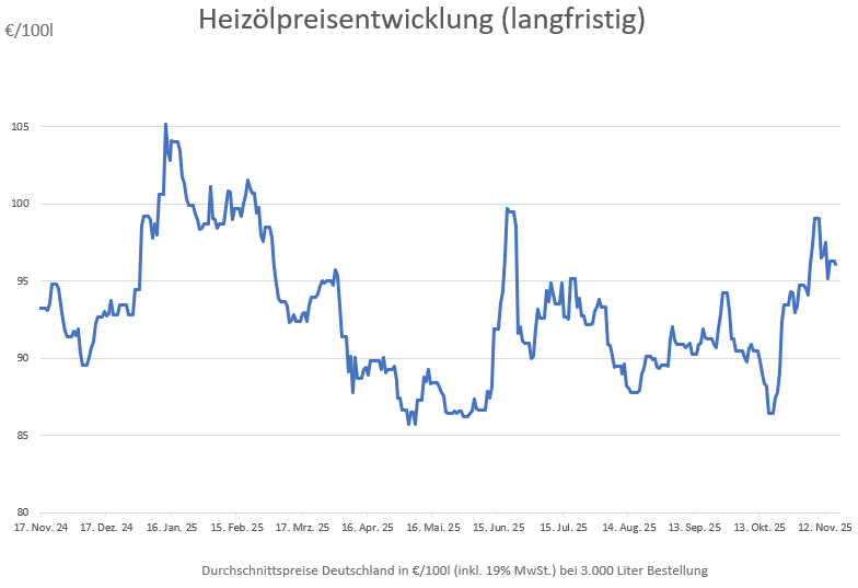 Die genannten Heizölpreise beziehen sich stets auf den deutschlandweiten Durchschnittspreis bei einer Bestellung von 3.000 Liter Heizöl Standard schwefelarm inklusive 19% MwSt. Außerdem fallen durch Transportkosten die Preise regional unterschiedlich aus. Stand der Preise 10.11.2025