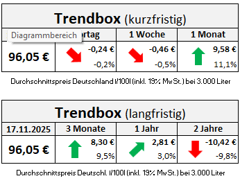 Schauen wir auf die Preise der vergangenen Sommersaison, zahlen die Verbraucher im Bundesgebiet zurzeit durchschnittlich +8,30 Euro mehr als noch Mitte August. Damals ist der Heizölpreis ebenfalls für kurze Zeit sehr niedrig gefallen. Ein schneller Blick auf die Trendbox kann daher täuschen, im Jahresverlauf ist der Preis aktuell zwar etwas höher, aber nicht ungewöhnlich hoch. Schauen wir auf die vergangenen Jahre, zahlen die Endkunden aktuell +2,81 Euro mehr als am 17. November 2024. Zur Herbst- und Wintersaison vor 2 Jahren war Heizöl noch weit teurer, damit verglichen zahlt man heute -10,42 Euro weniger.
