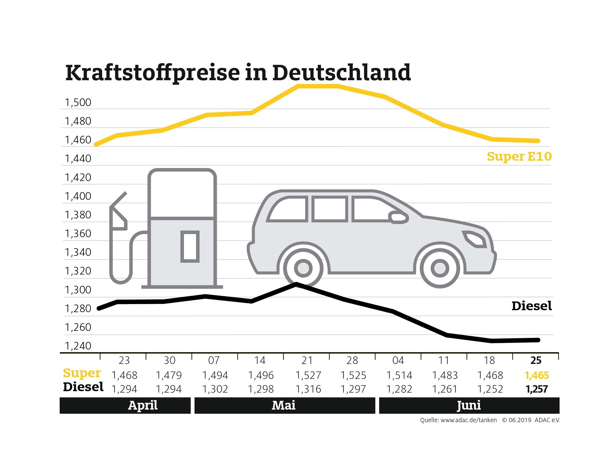 Die Kraftstoffpreise an den Tankstellen bewegen sich derzeit nur gering. Dies ergibt die aktuelle Auswertung des ADAC. Autofahrer müssen für einen Liter Super E10 im Bundesdurchschnitt 1,465 Euro bezahlen, 0,3 Cent weniger als in der Vorwoche. Diesel hingegen verteuerte sich um 0,5 Cent auf 1,257 Euro je Liter.