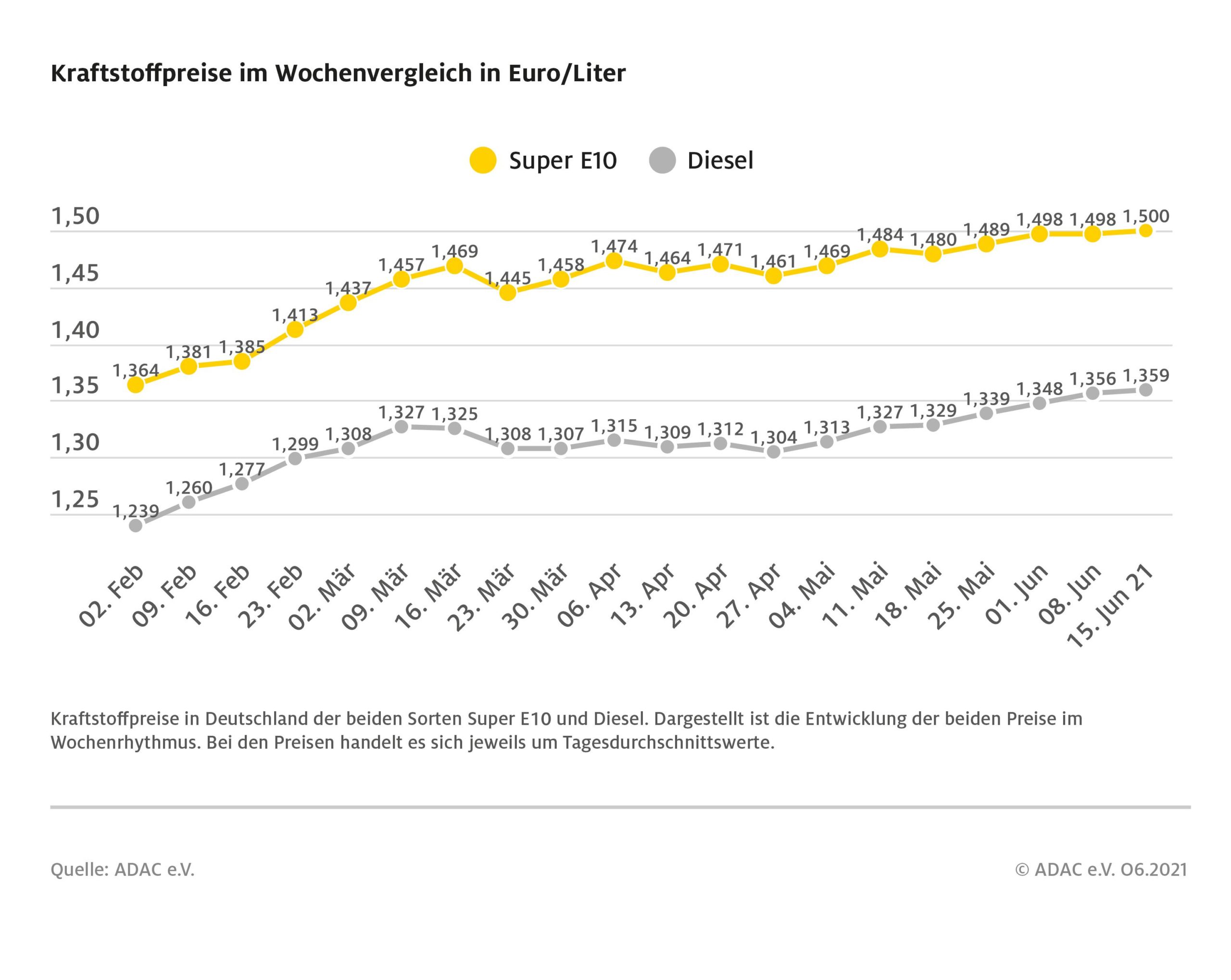 München (ots) – Nach mehreren Wochen eines leichten, aber kontinuierlichen Anstiegs hat der Preis für einen Liter Super E10 die Marke von 1,50 Euro erreicht. Dies zeigt die aktuelle ADAC Auswertung der Kraftstoffpreise in Deutschland. Danach kletterte der Preis für E10 binnen Wochenfrist um 0,2 Cent und kostet derzeit im bundesweiten Mittel 1,500 Euro. Diesel verteuerte sich um 0,3 Cent je Liter und liegt nun bei durchschnittlich 1,359 Euro.