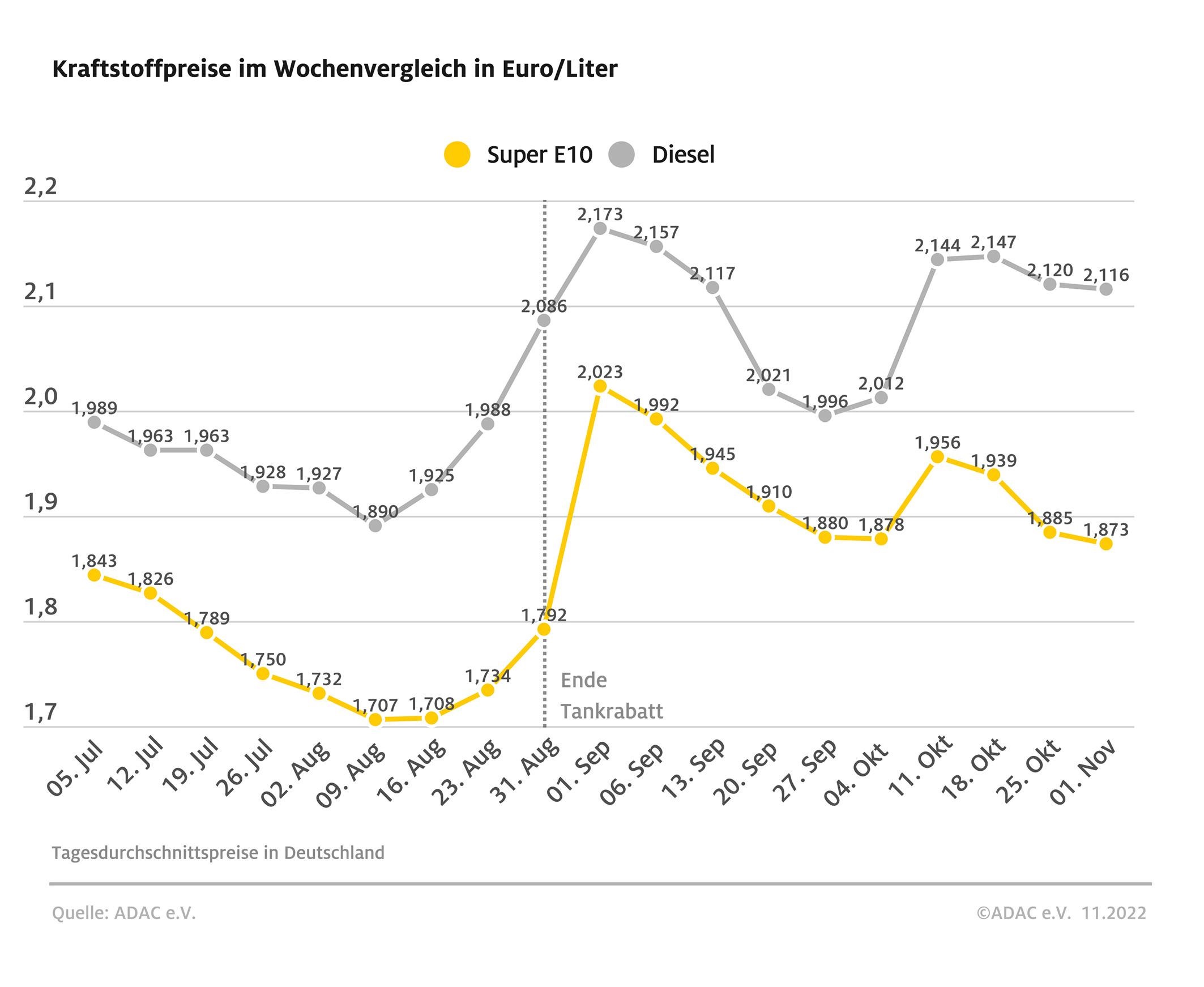 Der teuerste Tag zum Tanken war im vergangenen Monat der 16. Oktober: Ein Liter Super E10 kostete an diesem Tag 1,960 Euro, ein Liter Diesel 2,149 Euro. Der günstigste Tag des Monats war für die Fahrer von Benziner-Pkw der 28. Oktober bei einem Durchschnittspreis von 1,872 Euro. Diesel-Fahrer konnten am 3. Oktober bei 2,011 Euro am preiswertesten tanken.